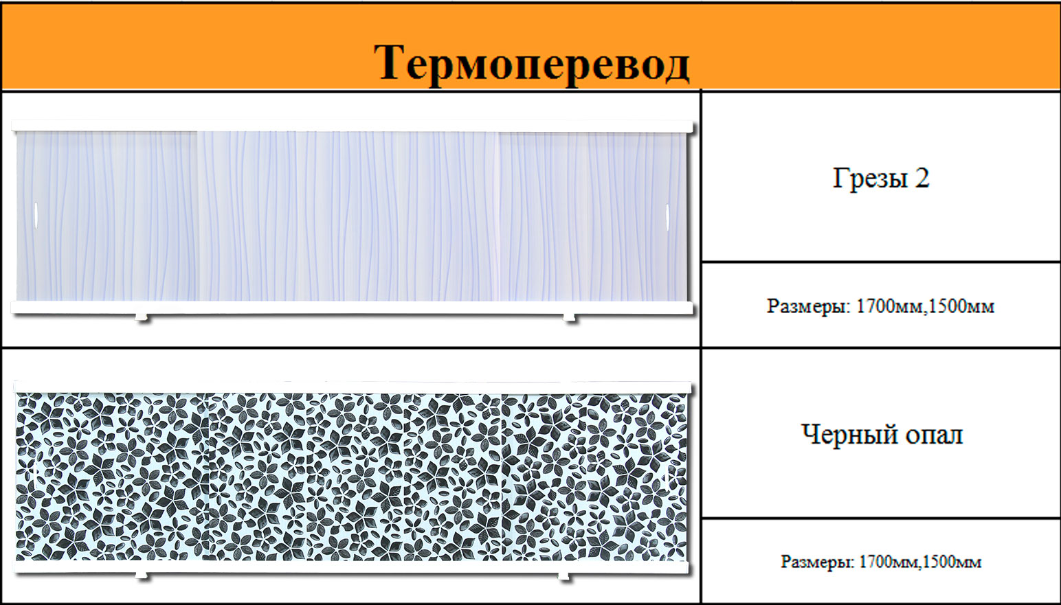 Полный ассортимент возможных для изготовления экранов под ванну в дизайне "термоперевод" можно посмотреть ЗДЕСЬ